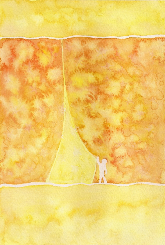 「オレンジ色のカーテンを小さな人がこちらから少し開けて見せてくれているでしょう。